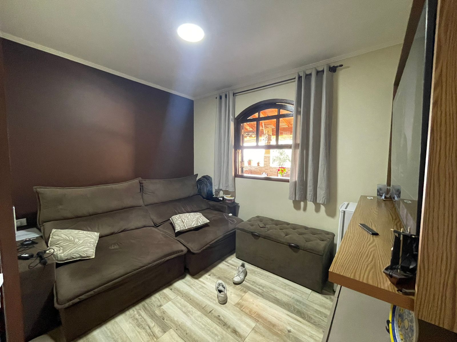 Cozinha, sala de estar, sala de tv, suíte com closet e varanda, 1 banheiro, lavanderia e área guorment com churrasqueira e forno na parte térrea.
